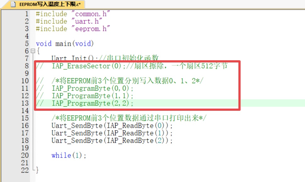 通过以上程序,已将STC12C5A60S2单片机内部EEPROM的前三个地址内容写入了数据0、1、2,现在修改主程序,屏蔽“写”操作,只进行“读”操作,修改如下: