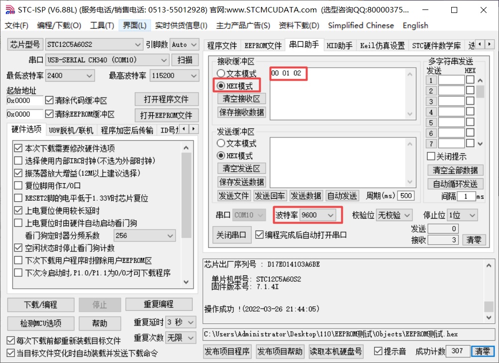 (3)断开开发板电源,然后重新通电,查看串口工具,发现打印的数据依然是0、1、2(实验效果和上图串口工具显示的内容一致),说明我们EEPROM确实操作成功了,实现了“掉电保存”功能。