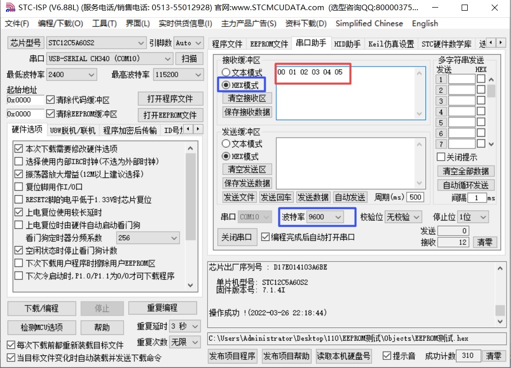 对STC12C5A60S2单片机内部EEPROM进行操作,断开电源,重新上电,检查是否可以实现掉电存储,试验成功。