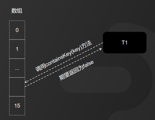 举个例子,现在有线程T1调用了 ConcurrentHashMap 的 containsKey(key) 方法,我们期望返回的结果是false,也就是说,T1并没有往ConcurrentHashMap中 put null(空)值。