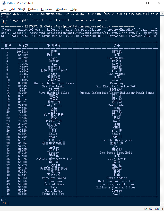 table = PrettyTable([u'排名', u'评论数', u'歌曲名称', u'歌手'])