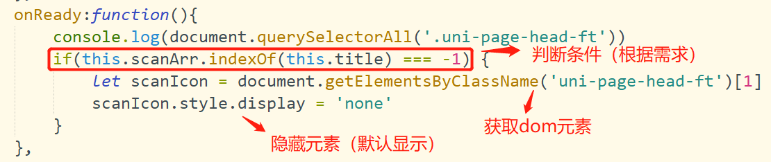 在onReady / mounted 中通过dom节点获取元素“uni-page-head-ft”,这边可以根据类名(document.getElementsByClassName)、选择器(document.querySelectorAll)两种方式获取