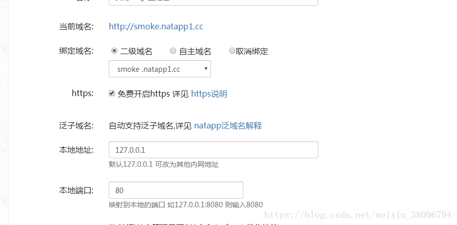 免费的那个实测不行,一个月9块钱。购买好了之后在“我的隧道”中配置自己的域名,因为微信拒绝三级以上的域名直接访问,所以先随便注册一个三级的域名,再修改成二级,还要花三块钱(一年)升权限,本地地址默认,端口用80: