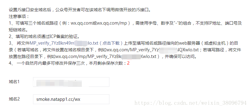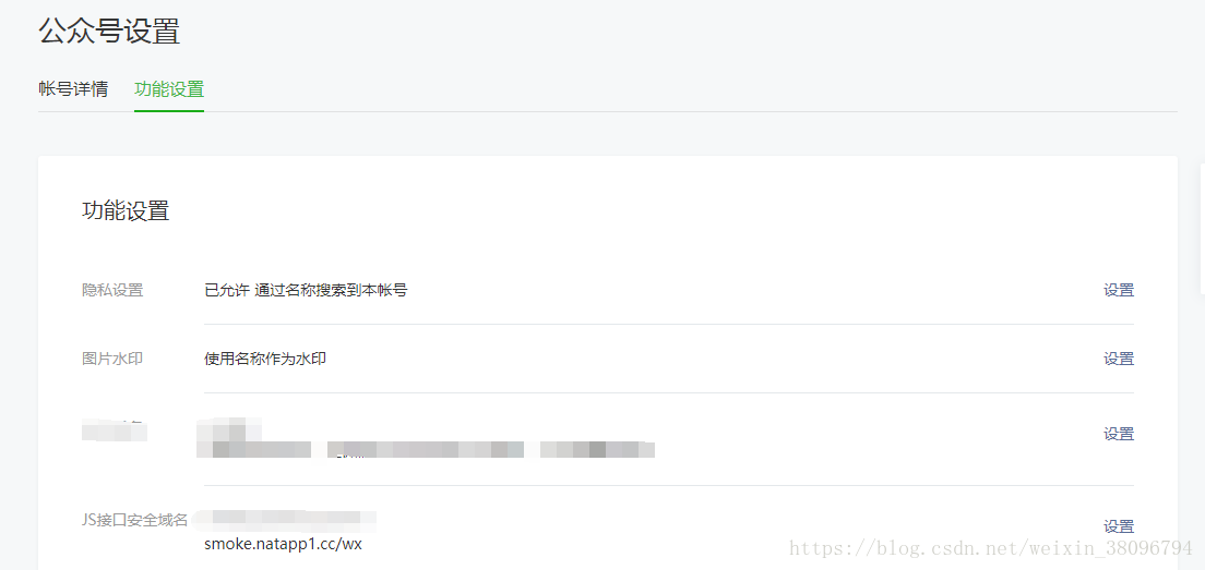 第三步:按照微信的官网介绍,完成自己这个域名在公众号的注册。在微信公众号主页,进入设置->公众号设置->功能设置->js安全域名,将刚才我们的域名设置进去。
