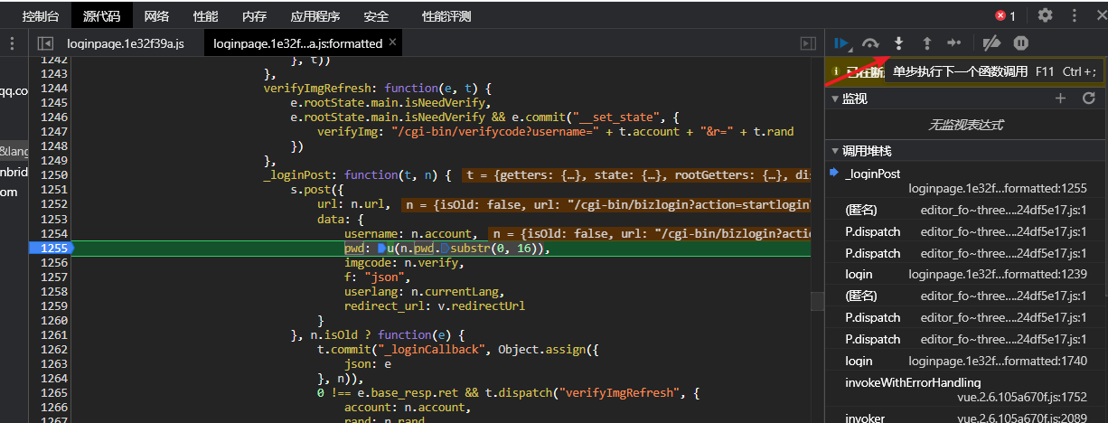 再重新点击登录,登录过程会触发js加密函数,如果我们在其上加上了断点,那么程序就会停止,这样就能够找到加密函数。