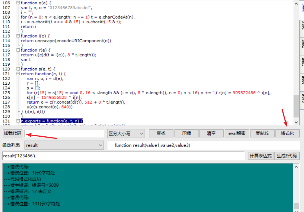 复制进去,点击格式化,加载代码。里面提示缺什么我们就补什么,反正都是在js代码中进行寻找