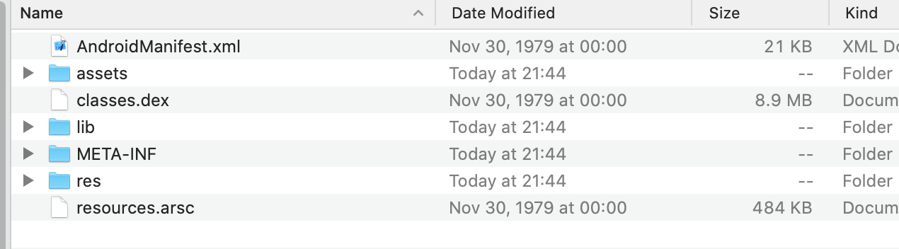 APK(全称:Android application package,Android应用程序包)是Android操作系统使用的一种应用程序包文件格式,用于分发和安装移动应用及中间件,基于 ZIP 文件格式,如果把后缀名修改为zip,可以看到如下结构: