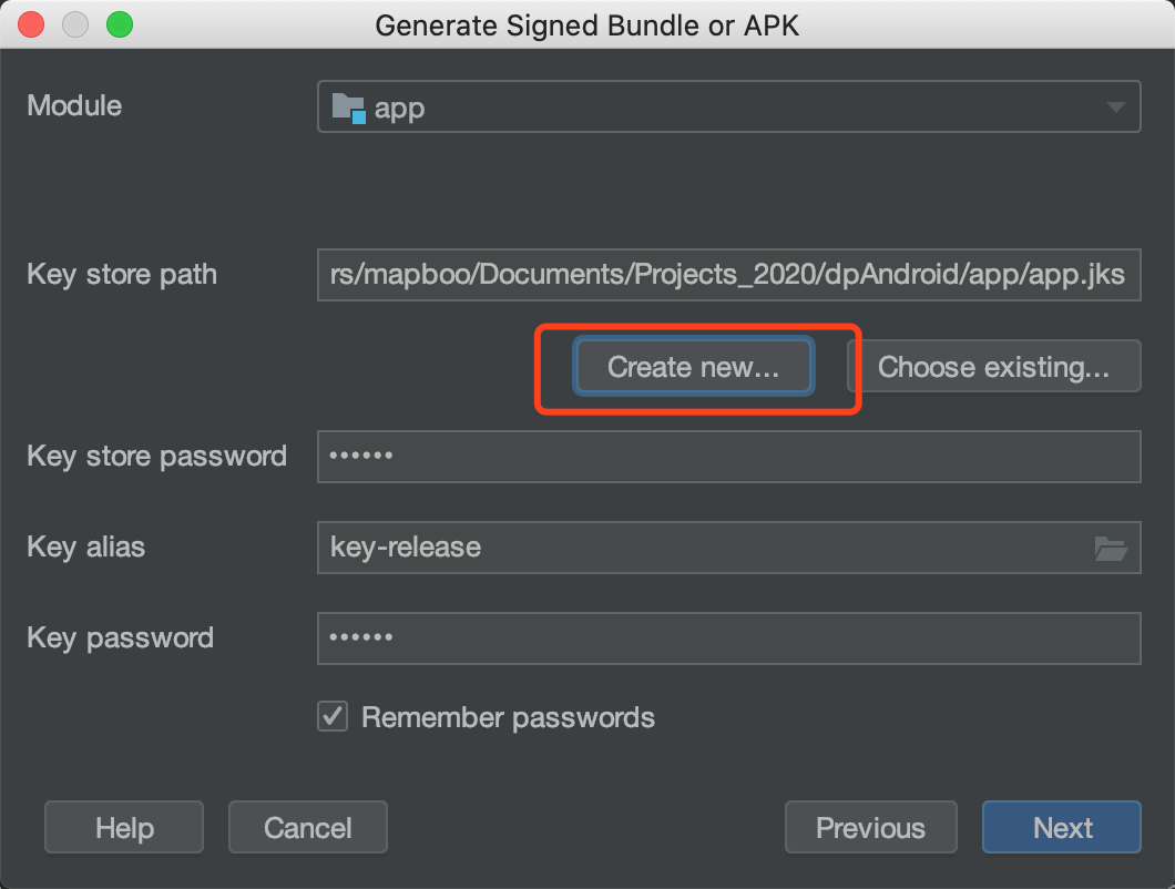 3. 如果没有创建过jks签名文件,点击Create New..,根据信息填写创建即可,如果已经有,则直接选择签名文件,如下图: