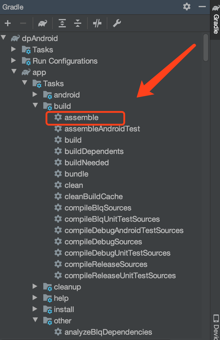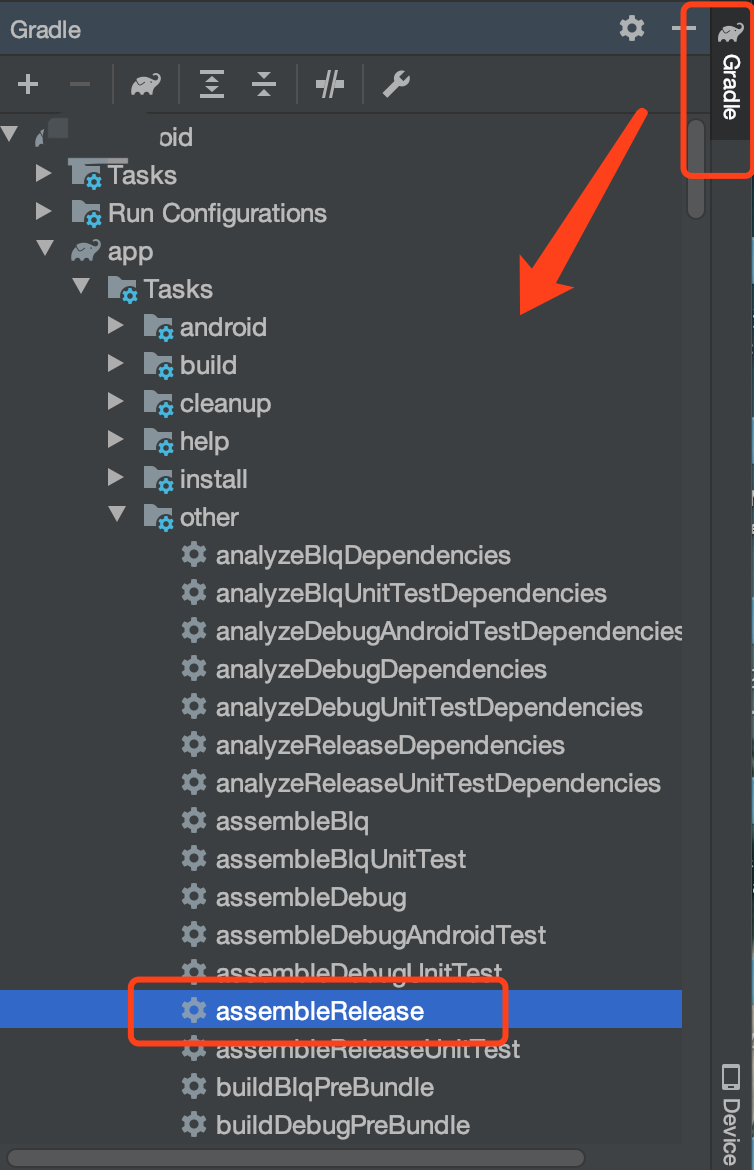3. 点击IDE右侧菜单栏Gradle->项目名->:app->Tasks->build / other 如下2图: