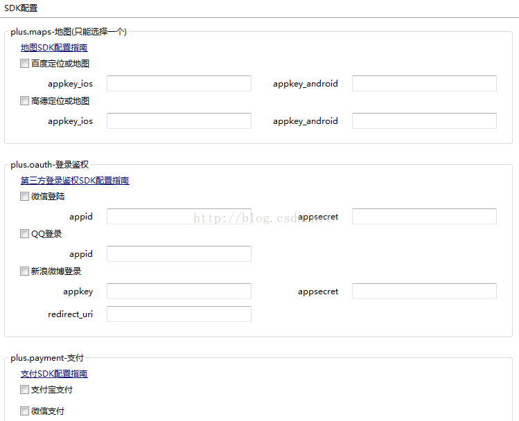 (3)、SDK配置:根据项目需求选择需要的SDK并进行配置,要实现功能需要到第三方开发平台申请应用后获取相关配置参数,例如微信登录需要申请appid和appSecret,appid:微信开放平台申请应用的AppID值;appSecret:微信开放平台申请应用的AppSecret值。