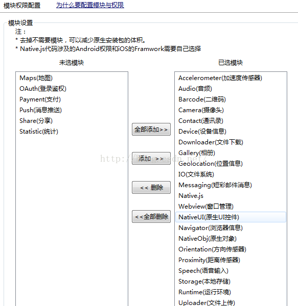 (4)、模块授权配置:根据项目需求添加模块,部分模块必须进行SDK配置,例如地图、登录授权等。
