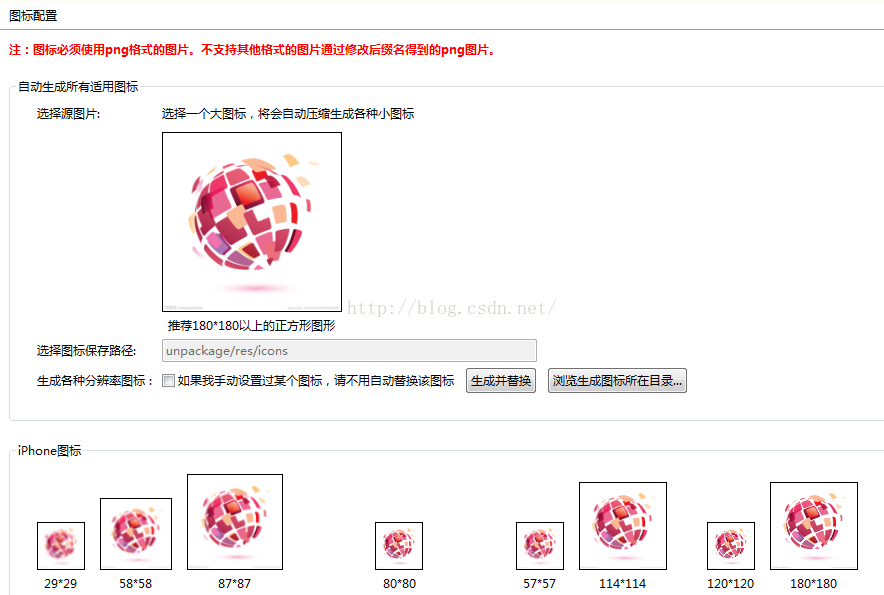 (2)、图标配置:所有图片格式必须是png,且严格符合分辨率要求。使用其他图片格式重命名为png会导致打包失败。配置图标时选择自动生成所有适用图标,选择一个大图标然后点击生成并替换即可。