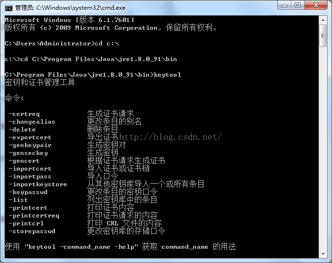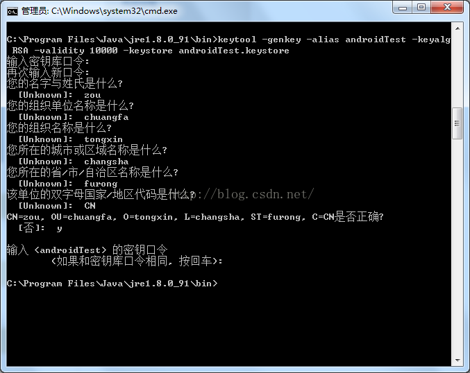 生成Android签名证书,确保电脑上安装了JRE,我们将使用JRE自带的创建和管理数字证书的工具Keytool。使用以下命令生成证书: