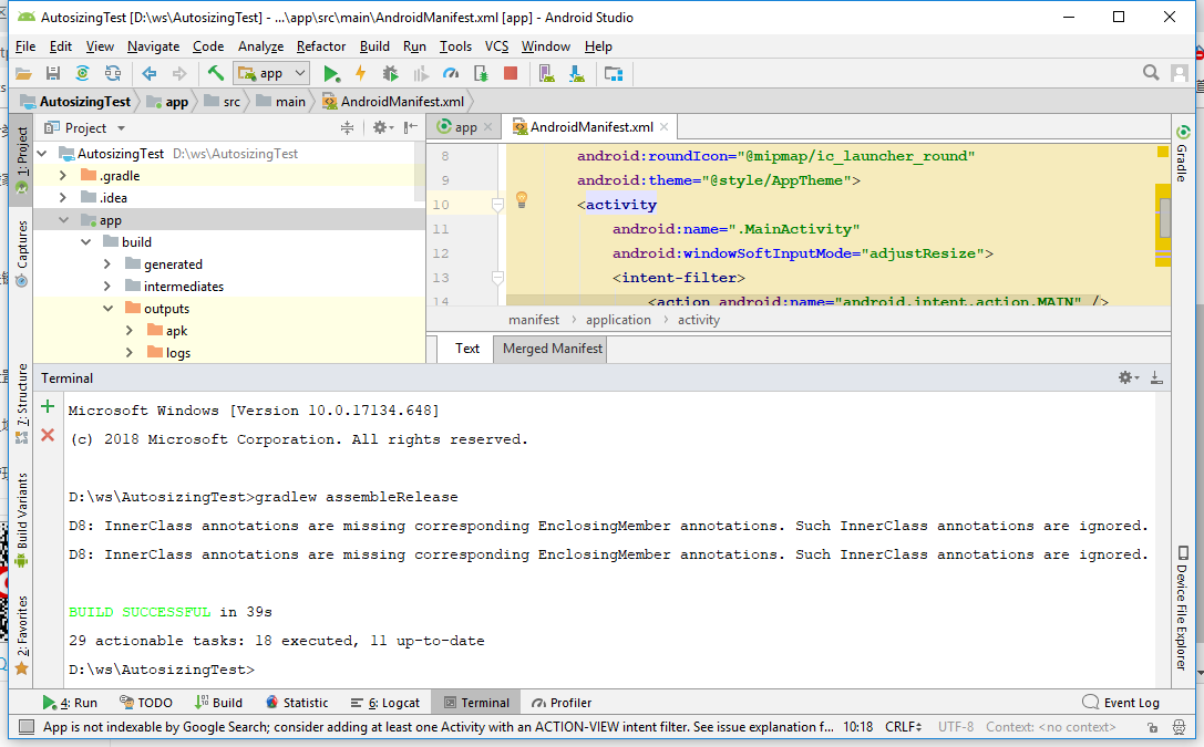 如下如所示,在Terminal命令行中输入gradlew assembleRelease或者gradlew assembleDebug,然后回车开始编译。