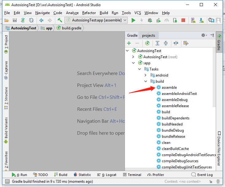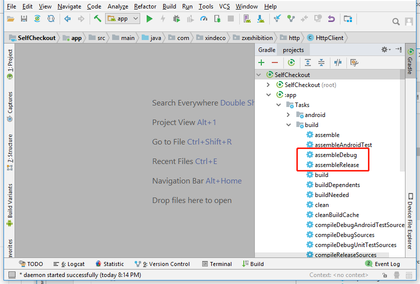 如下图所示,双击Gradle中的assembleDebug或者assembleRelease就可以开始编译
