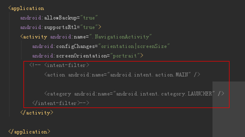 2)在AndroidManifest.xml文件里,去掉application里无用的代码,并去掉activity的入口代码。
