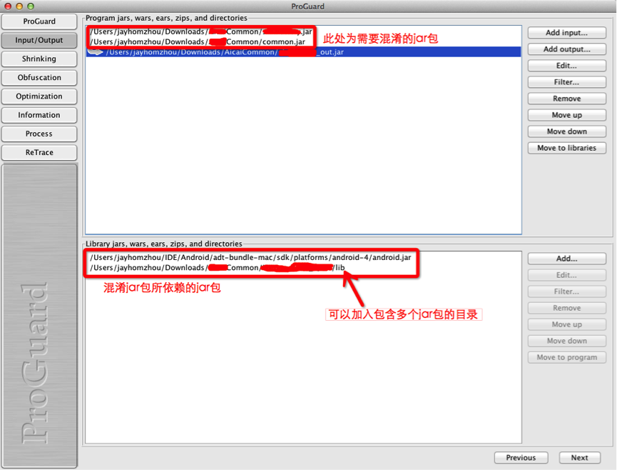 4、配置需要混淆的jar包,需要注意的是上部分是可以把多个jar包混淆输出成一个jar包,下半部分为混淆时所需的依赖jar包。