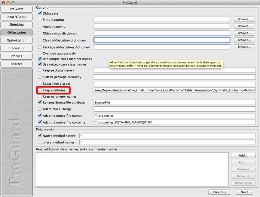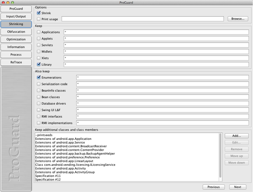 5、配置那些内容在混淆时忽略的,这里我选择了“Library”和“Enumeration”。