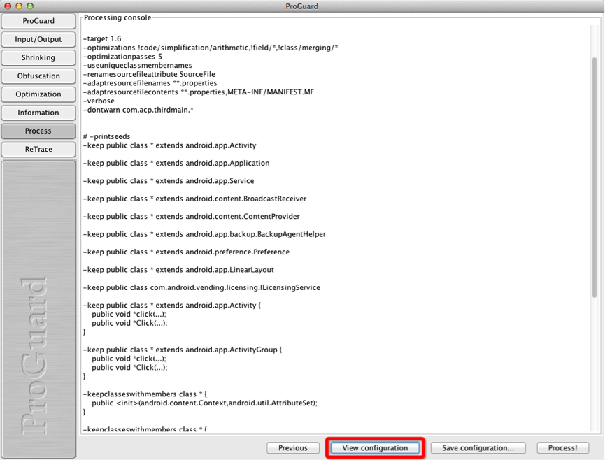 9、点击红框的按钮后,界面出现对上面一系列配置进行的汇总,此时最好进行保存(红框版本的按钮)。保存后的文件为.pro后缀,可以使用编辑软件进行对其作修改(必须按照proguard规范进行),再按照上述步骤进行重新加载。到这里一起工作已经就绪,那么点击“Process”开始混淆吧!(遇到警告或错误停止混淆,请使用“-dontwarn”进行屏蔽处理)。祝你好运,一切顺利,哈哈。