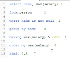 执行顺序: FROM -> WHERE -> GROUP BY -> HAVING -> SELECT -> ORDER BY ->limit