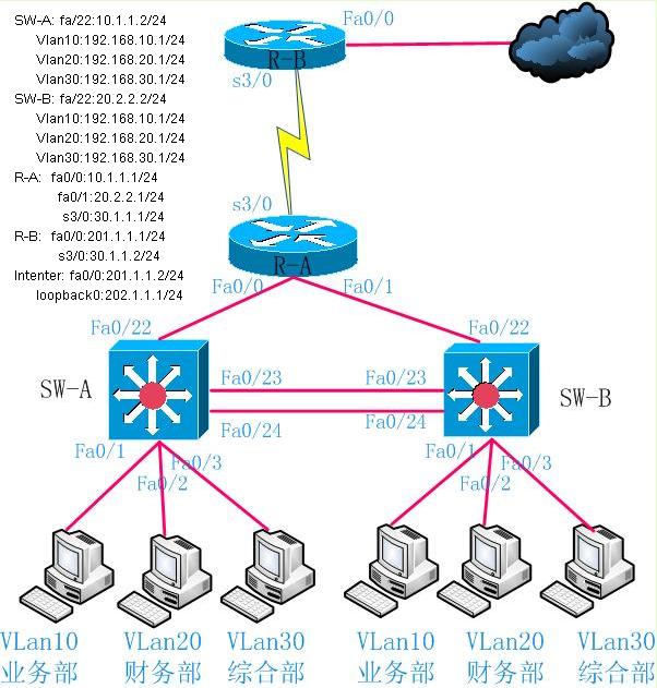 sw-B(config)#ip route 0.0.0.0 0.0.0.0 20.2.2.1 (注释:配置一条默认路由到R-A,下一跳IP地址为R-A上fa0/0上的IP地址)