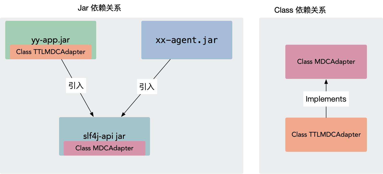 简单回顾下以上的操作: 我们使用了两个jar包:xx-agent.jar 与 yy-app.jar。其中都引入了slf4j-api jar,我们在yy-app.jar中定义了类:TTLMDCAdapter,他implements MDCAdapter。