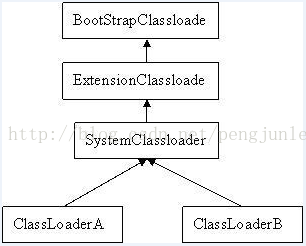 通过上面的代码分析,我们可以对JVM采用的双亲委派类加载机制有了更感性的认识,下面我们就接着分析一下启动类加载器、标准扩展类加载器和系统类加载器三者之间的关系。可能大家已经从各种资料上面看到了如下类似的一幅图片: