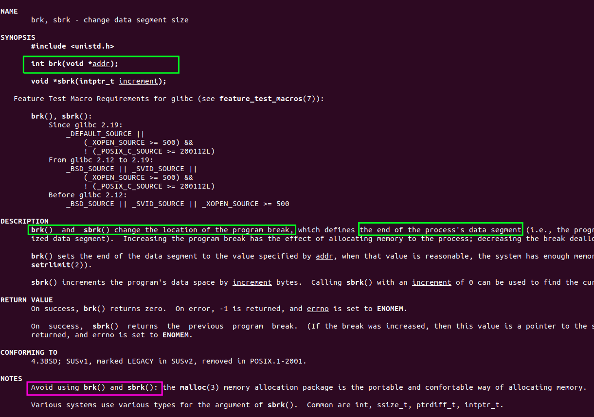 实际上,Linux系统只有1个brk()系统调用,它既设置进程数据段的末尾,又会把这个值返回给应用程序。