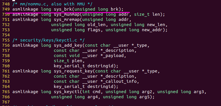 Linux内核的头文件里,brk()系统调用的处理函数sys_brk()是这么定义的,如上图。