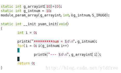 insmod yuan.ko g_arrayint=10,20,30 (插入模块带着参数最终g_intnum的值为你实际传入的参数个数)