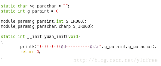 insmod yuan.ko g_paraint=3 g_parachar="woshishui" (插入模块时带着参数)