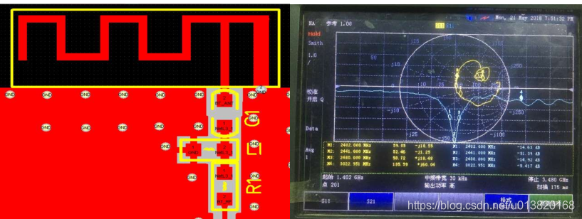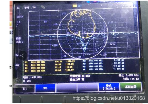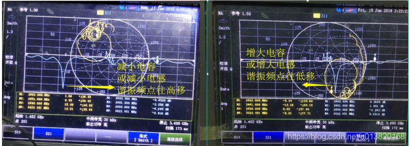 增大电容值或增大电感值可是谐振频点往低移动,使谐振点接近 2.441GHz