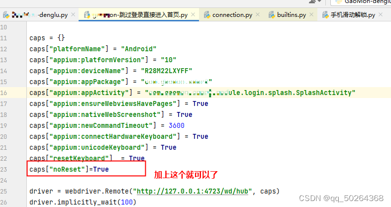 每次执行代码都要清空所有数据并且走一遍登录流程,才能执行操作太麻烦了,下列代码可以直接跳过登录进入app首页 caps["noReset"]=True