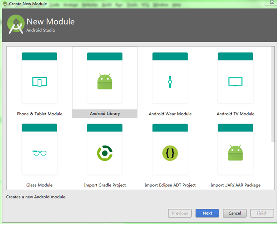 2.(在步骤1的基础上)点击File-->New-->New Module—>选择Android Library-->点击Next(如下图:)