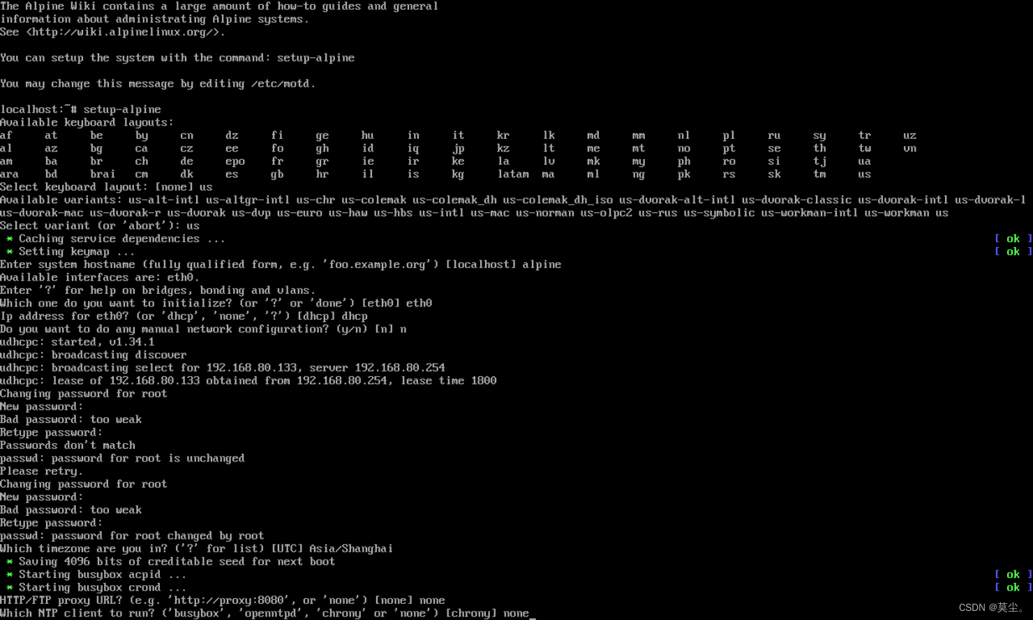 使用setup-alpine来进行写入磁盘,设置语言,时区,IP地址,NTP服务器,用户和用户密码等