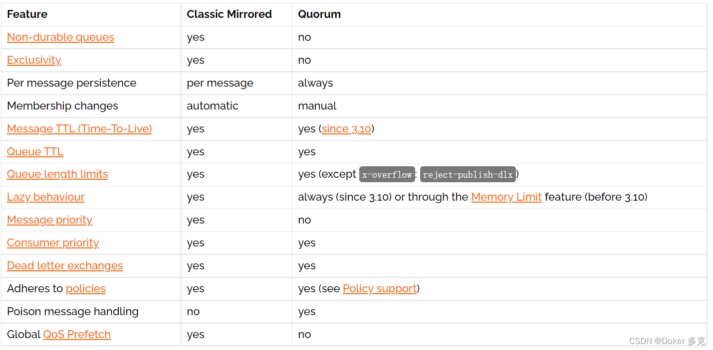 与传统镜像队列相比,仲裁队列在行为上也存在重要差异和一些限制, 包括特定于工作负载的,例如,当使用者重复对同一消息重新排队时。另外仲裁队列支持死信交换 (DLX)。