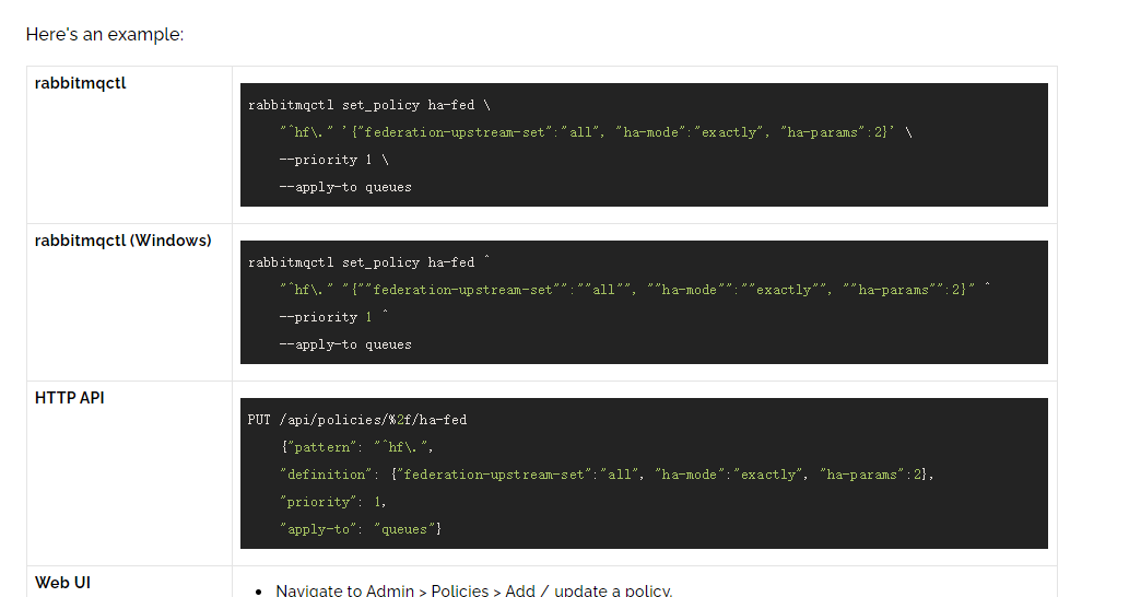rabbitmqctl set_policy ha-two "^" '{"ha-mode":"exactly","ha-params":2,"ha-sync-mode":"automatic"}'