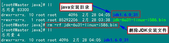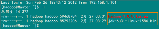 刚才我们用一般用户(hadoop)通过FlashFXP软件把所需的两个软件上传了跟目下,我们通过命令查看下一下是否已经上传了。