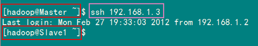 例如:机器为"Master.Hadoop:192.168.1.2"对机器为"Salve1.Hadoop:192.168.1.3"用命令"ping"记性连接测试。测试结果如下: