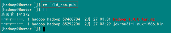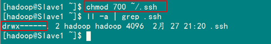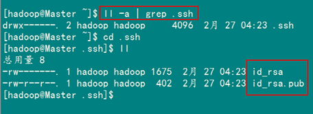 查看"/home/hadoop/"下是否有".ssh"文件夹,且".ssh"文件下是否有两个刚生产的无密码密钥对。
