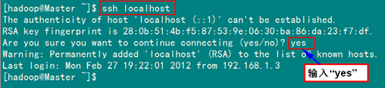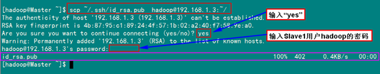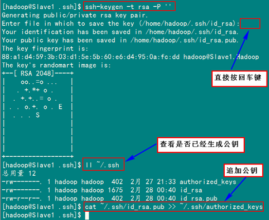 这条命是生成其无密码密钥对,询问其保存路径时直接回车采用默认路径。生成的密钥对:id_rsa和id_rsa.pub,默认存储在"/home/hadoop/.ssh"目录下。