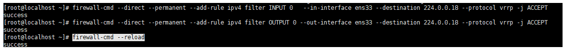 firewall-cmd --direct --permanent --add-rule ipv4 filter INPUT 0 --in-interface ens33 --destination 224.0.0.18 --protocol vrrp -j ACCEPT