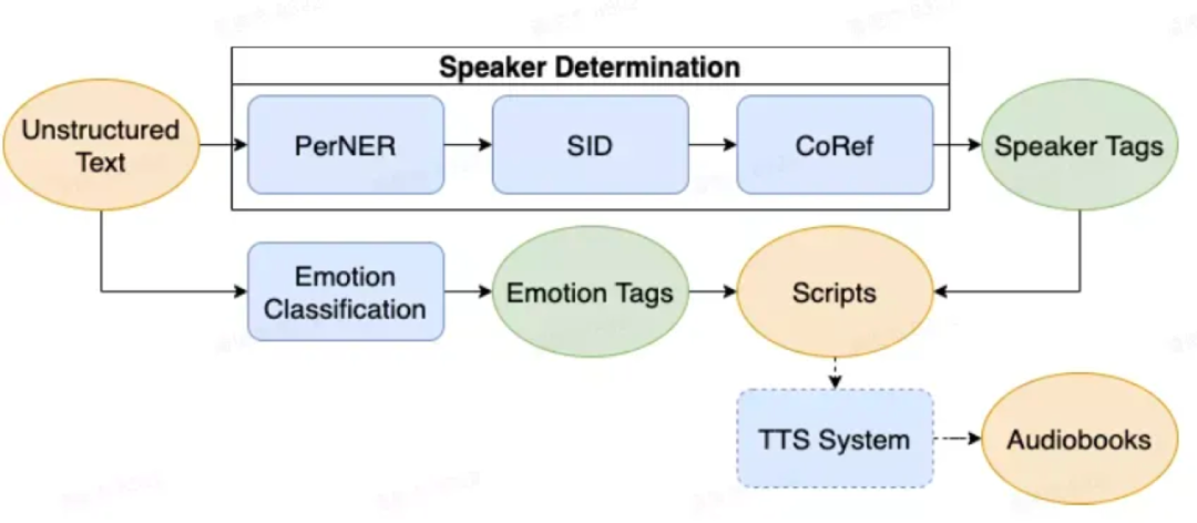 此外为了让语音听感更佳,团队还基于常规 TTS 流程加入了更多功能模块,实现了角色归属与情感控制。例如在角色归属中同样采用了 bert 结构,进行对话判定和指代消歧两个任务的建模,另外也采用了类似的结构进行情感预测。“通常小说文字中会出现多人对话,每个说话人又有属于自己的多种情感,如果可以将音色和情感进行解耦,就可以更好地控制合成语音的表现力,实现不同音色与不同情感的灵活组合,这个很关键。”