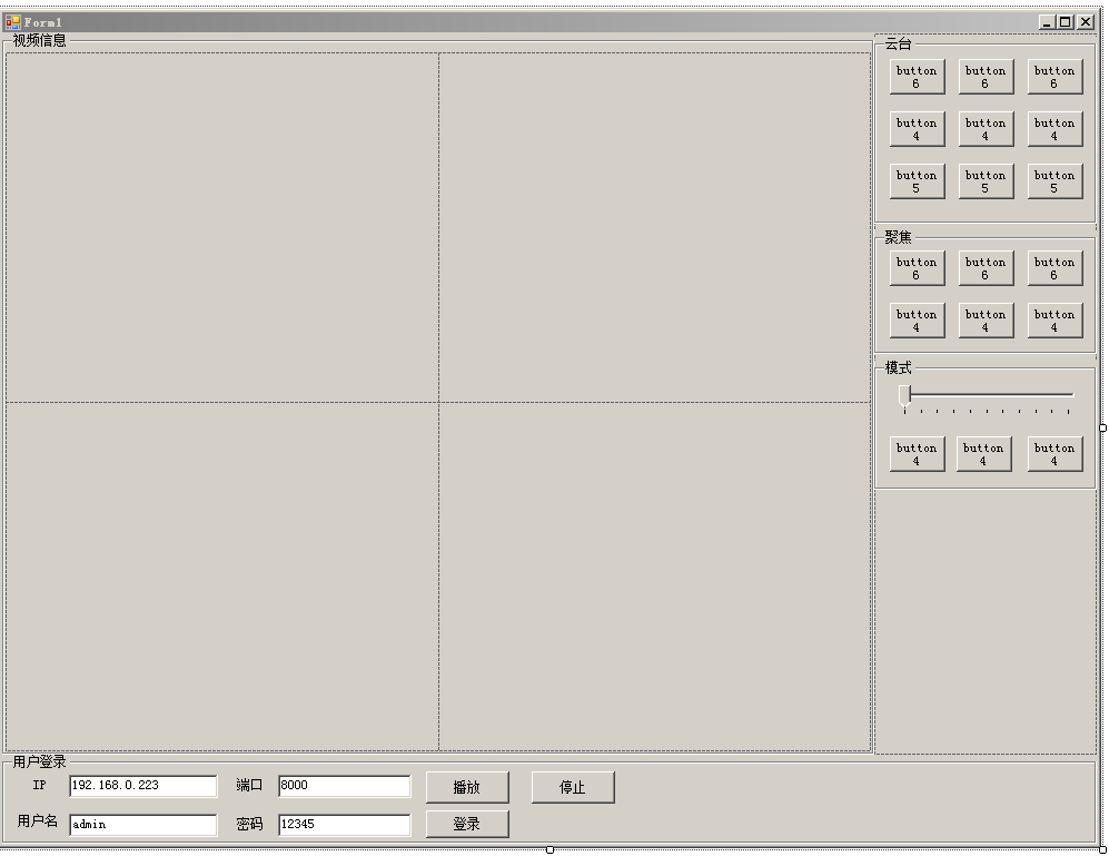using System; using System.Collections.Generic; using System.ComponentModel; using System.Data; using System.Drawing; using System.Linq; using System.Text; using System.Windows.Forms; using SIMUHKNETSDK; namespace SIMUSDK { public partial class Form1 : Form { private int m_videoHandle;//视频Handle private int m_userID;//当前用户ID public Form1() { InitializeComponent(); } private void button1_Click(object sender, EventArgs e) { bool flag =SIMUHKNETSDK.SIMUHKNETSDK.NET_DVR_Init(); int success = LoginVideo(); if (success == -1) { groupBox1.Text = "用户登录[连接失败]"; } else { groupBox1.Text = "用户登录[连接成功]"; } } private int LoginVideo() { SIMUHKNETSDK.NET_DVR_DEVICEINFO serInfo = new SIMUHKNETSDK.NET_DVR_DEVICEINFO(); m_userID = SIMUHKNETSDK.SIMUHKNETSDK.NET_DVR_Login(txtIP.Text, int.Parse(txtHost.Text), txtUserName.Text.ToString(), txtPassword.Text.ToString(), out serInfo); return m_userID; } private void button2_Click(object sender, EventArgs e) { for (int i = 1; i <= 4; i++) { Panel panel = new Panel(); NET_DVR_CLIENTINFO cli = new NET_DVR_CLIENTINFO(); cli.lChannel = i; cli.lLinkMode = 0; cli.hPlayWnd = panel.Handle; panel.Dock = DockStyle.Fill; cli.sMultiCastIP = "0.0.0.0"; tableLayoutPanel1.Controls.Add(panel); m_videoHandle =SIMUHKNETSDK.SIMUHKNETSDK.NET_DVR_RealPlay(m_userID, ref cli); } } } }