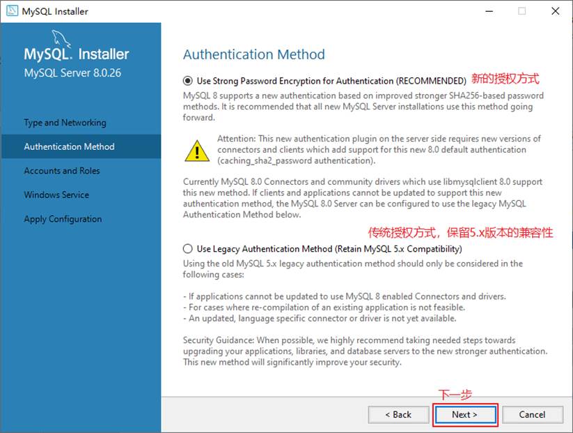 步骤3:单击“Next”(下一步)按钮,打开设置授权方式窗口。其中,上面的选项是MySQL8.0提供的新的授权方式,采用SHA256基础的密码加密方法;下面的选项是传统授权方法(保留5.x版本兼容性)。