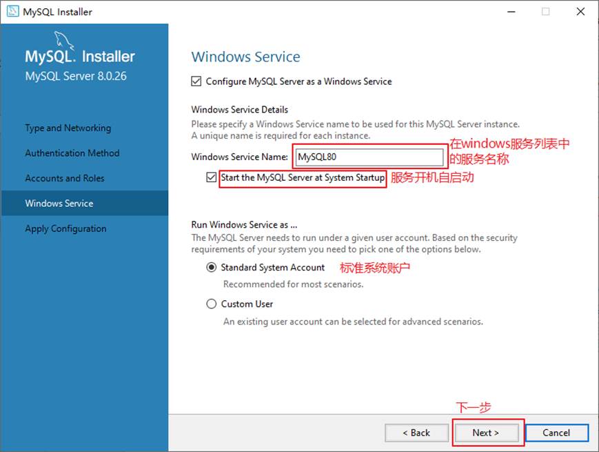 下面是选择以什么方式运行服务?可以选择“Standard System Account”(标准系统用户)或者“Custom User”(自定义用户)中的一个。这里推荐前者。