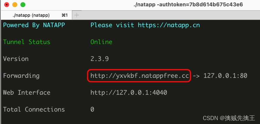 - 在终端执行 ./natapp -authtoken=上面查看到的 authtoken,然后访问圈住的链接即可。