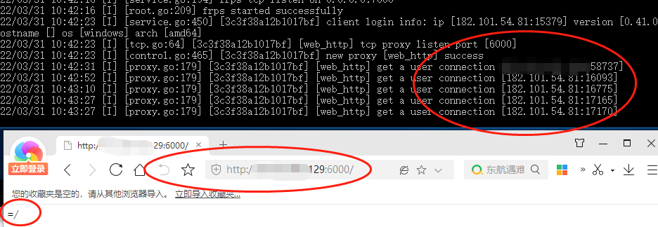 当我们访问公网 ip + 6000 端口时,我们服务器就会处理6000端口消息,然后将消息转到服务器7000端口,7000端口因为一直保持和我们本地电脑的长链接,那我们内网本地电脑的7000端口,就会收到服务器的7000端口消息,然后本地电脑会7000转80端口,模拟出内网电脑 80 端口的消息,这里就是 [web_http];