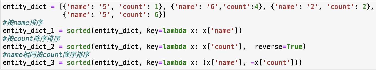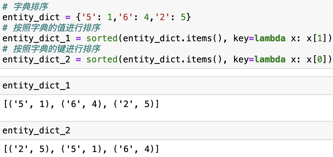以entity_dict.items()返回的列表中的每一个元素,作为匿名函数(lambda)的参数,x[0]即用“键”排序,x[1]即用“值”排序;返回结果为新的列表,可以通过dict()函数转为字典格式。