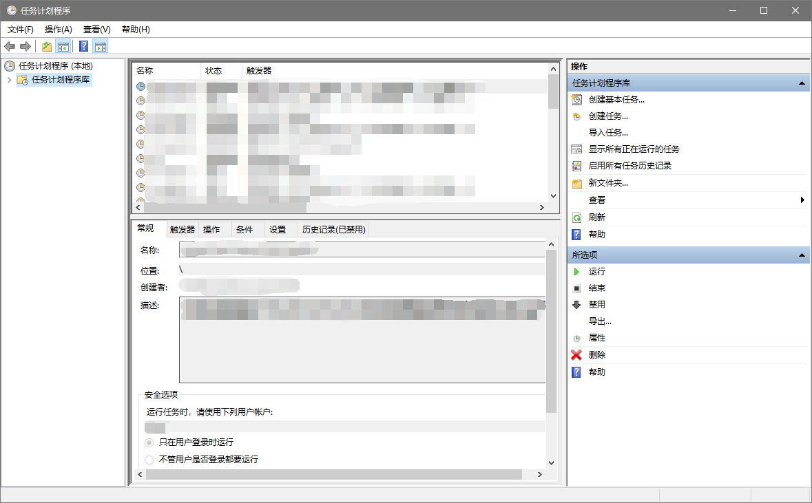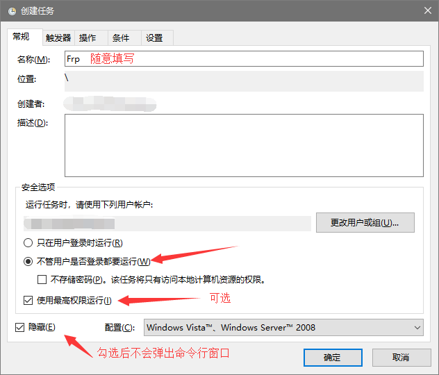 点击右侧的 “创建任务”,名称随意填写,安全选项选择 “不管用户是否登录都要运行”,当然你也可以选择 “只在用户登录时运行”。